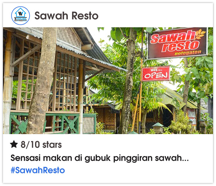 Restoran Yogyakarta yang satu ini memang bisa dibilang memiliki banyak keunikan dari pada resto lainnya. Lokasi tempat makan yang disediakan di wilayah persawahan yang terhampar luas nan hijau menjadikan suasana makan menjadi lebih nyaman. Selain dapat menikmati cita rasa masakan yang nikmat, di restoran ini anda juga bisa sejenak melepas beban penat dengan menikmati udara segar sekaligus suasana sejuk di hamparan sawah yang indah.
